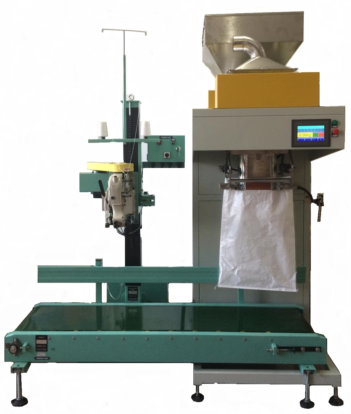 Linie de inchis saci la gura cu cantar electronic si umplere automata a sacilor.Caracteristici :Materialul ambalat este de tip granular (cereale, orez, sare, nisip, etc.). Interval de cantarire : 10 - 50 Kg/sac. Diviziuni intermediare : 10 g. Toleranta cantar : 0,2%. Viteza de cantarire/ambalare : 360 - 500 saci/ora. Tensiunea de lucru : 380V (50Hz). Pret : 14.800 Euro (fara TVA). Avantaje: - permite reglarea inaltimii capului de coasere dar si a benzii transportoare, in functie de inaltimea sacului. Optional linia poate fi dotata cu urmatoarele dispozitive: - incarcator vertical pentru alimentarea silozului in care este stocat materialul pentru cantarire si umplere a sacilor In functie de specificul utilizatorului, inchiderea sacilor se poate face prin lipire termica in loc de coasere (specific ambalarii in saci transparenti din polietilena). |